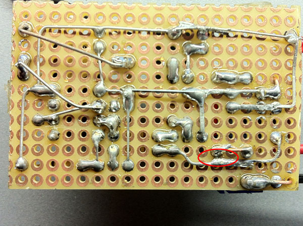 Mir fallen zwei Sachen auf, die nicht ganz OK sind. Zum einen die rot eingekreiste Lötstelle, allerdings kann ich nicht 100%ig erkennen, wie die oberen zusätzlichen Brücken von dir verlaufen: