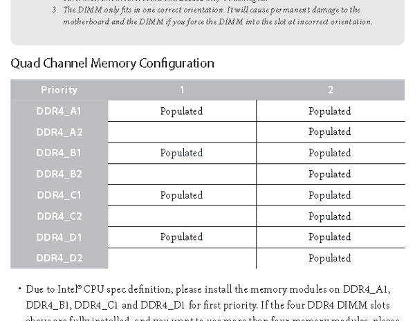 Scheint eine der ersten Handbuch Revisions zu sein, DDR3 stimmt ebenfalls nicht. Blätter mal ein wenig in der aktuellsten Online Version, da steht es richtig beschrieben. Hattest du eigentlich zwischenzeitlich auch die UEFI Defaults geladen ? Ich würde einfach mal richtig im Quad Channel Mode bestücken, dann Clear CMOS Taste drücken und den PC starten.