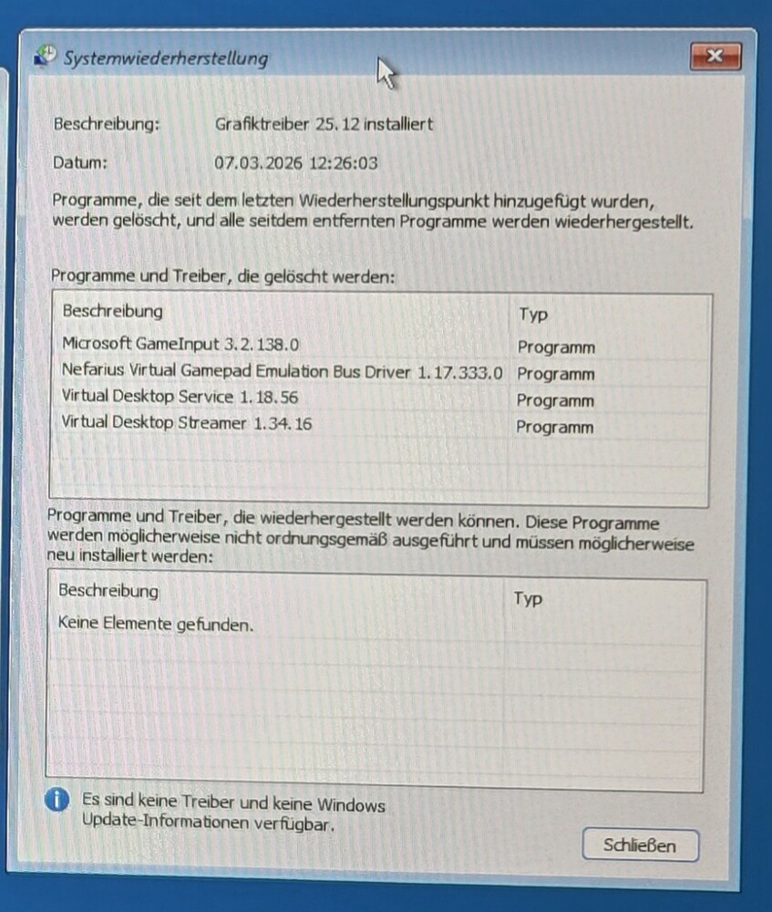 Ich kopier mal den Text von der anderen Stelle hier rein... Infos von Samstag 7.3.: Klar sind wir Gewöhnungstierchen ;) Bei Windows weiß ich, wie man Steam installiert, das brauch ich nicht googeln :biglol: :lol: Da funktioniert auch meine Tastatur wie sie soll :biglol: So, ich hab nun W11-24H2 neu installiert, die aktuellsten Chipsatztreiber drauf und den Adrenalin von Dezember '25. Das einzige, was ich nicht installiert hab, ist der WLAN Treiber (weil ich den nicht brauche). Virtual Desktop Streamer für die VR Brille ist drauf und VR funktioniert auch problemlos. Mittlerweile hat das 24H2 System sicher 15 Neustarts hinter sich und es ist nie hängen geblieben. Hoffentlich läuft es nun wieder. Dann bleib ich bei 24H2 bis Supportende im Oktober. Aaaaaahhhhhhhh, so ein Mist..... Nachdem die Treiber installiert waren, dachte ich mir vorhin, dass ich ja mal nen kleinen Test machen kann und ne kleine Runde zocken könnte. Also erst noch DSX installiert, damit ich meinen PS5 Controller in Forza Horizon 5 nutzen kann. Gemacht, getan.... FH5 gestartet und gleich mal ne Meldung kassiert, dass der Grafiktreiber nicht erkannt wurde :noidea: aber egal.... Spiel lief super flüssig in 4K auf max. Grafikeinstellungen. Soweit so gut. Nach ner halben Stunde dachte ich, dass ich mal testweise den PC neu starten könnte.... also Neustart gedrückt und nach dem POST bleibt der Kübel wieder hängen:bonk: :bonk: :bonk: Update von heute Morgen (8.3.) Ich hab wieder mal die System Wiederherstellung bemüht und geschaut, was sich seitdem am System geändert hat.