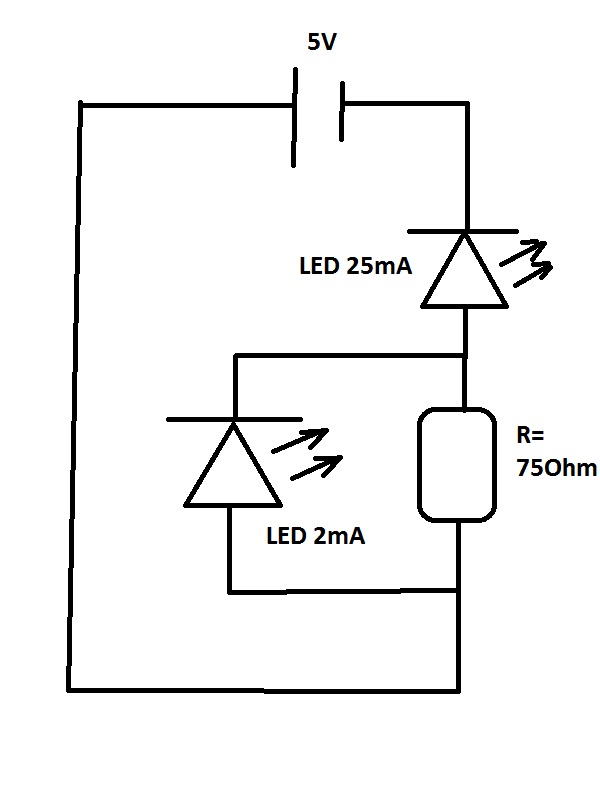 Meines Wissens nach brauch ich bezüglich der Spannung keinen Widerstand, jedoch machen mir die Unterschiedlichen Ströme sorgen, die kleine Rote LED2 wird einfach gegrillt