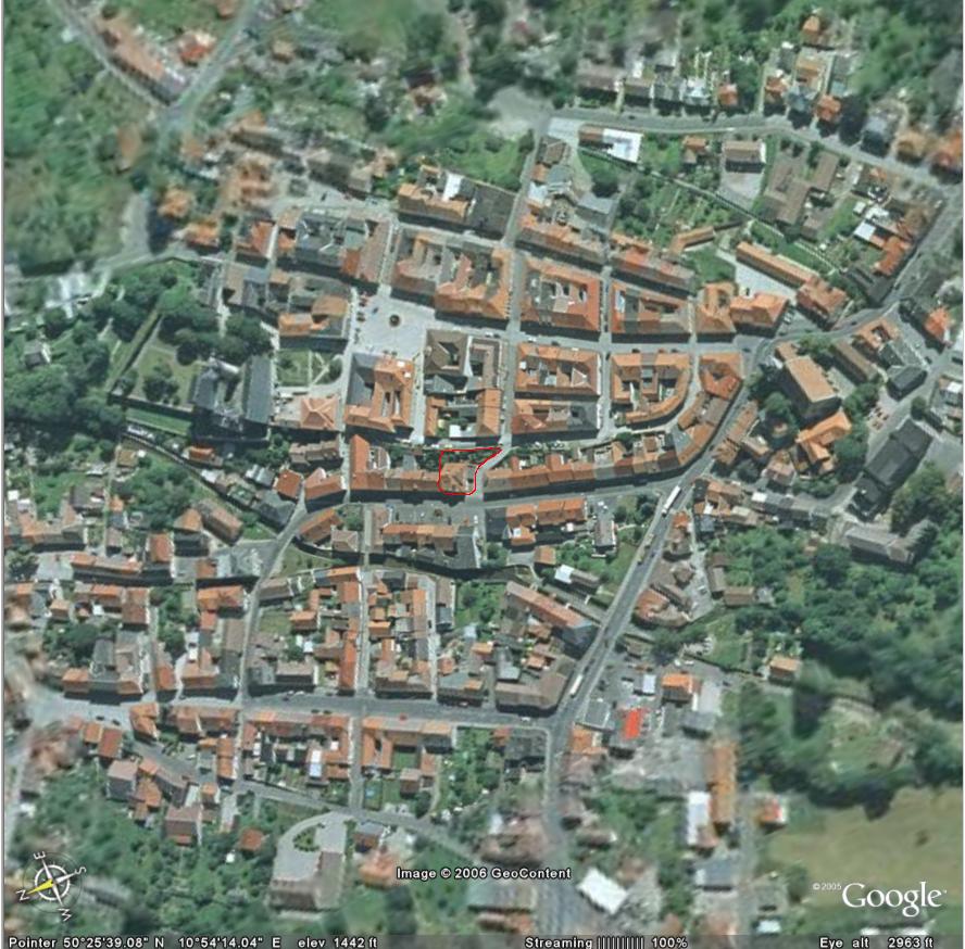 Das zweite Haus von links, also das rechts neben dem mit dem orangenen Dach.