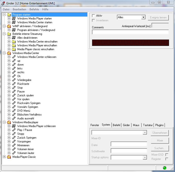 3)Girder Installation: Jetzt kann man Girder 3.29 installieren. Die Installation und die Grund Konfiguration, ist hier sehr gut beschrieben: https://www.ocinside.de/html/modding/usb_ir_receiver/usb_ir_treiber_d.html Für die weitere Konfiguration und der Einrichtung der GML-Datei sind diese Links sehr hilfreich: http://www.myhtpc.de/showtopic.php?threadid=59 http://www.myhtpc.de/howto_girder/Erweiterung_zu_Girder-Anleitung.html Diese Beiträge sollte man sich unbedingt durchlesen. Ich habe meine GML-Datei nach der Lektüre dieser Anleitungen eingerichtet. Meine GML-Datei kann man sich hier runterladen: https://www.ocinside.de/assets/user/home_entertainment_gml.zip