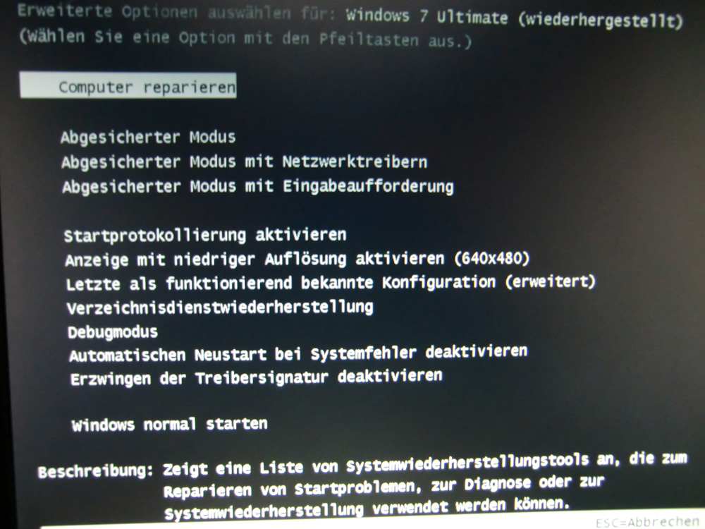 Das ist das falsche Menü. Nach dem Bios fertig ist und der Systemstart begonnen hat bekommt man ein zweites Menü, wenn man weiterhin F8 drückt. Dieses Menü ist das richtige.