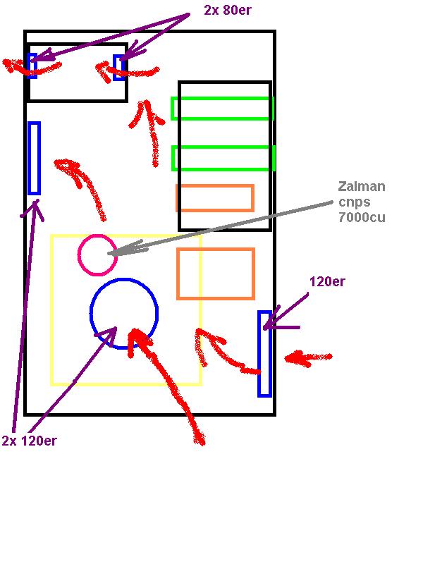 einfachste lösung wäre einfach oben ein loch rein und noch nen lüfter drauf. tja kühlt zwar gut - allerdings bin ich noch mehr auf RUHE aus. und jedes Loch mehr im rechner macht wiederum die Schallisolierung unnnütze...
